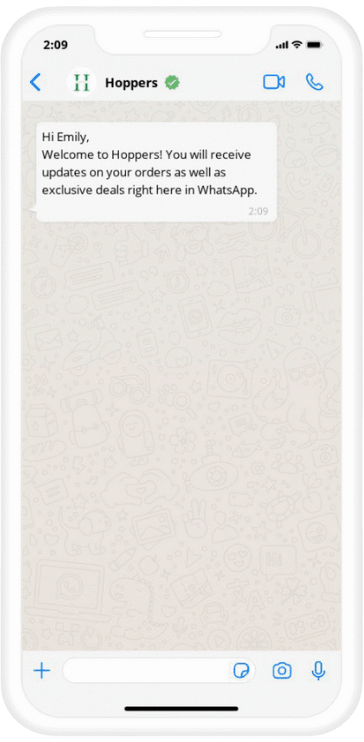 - Hi there, welcome to [Company name]. You will receive updates on your orders and exclusive deals right here on WhatsApp.